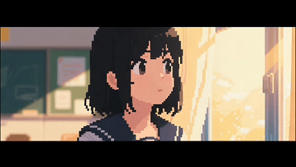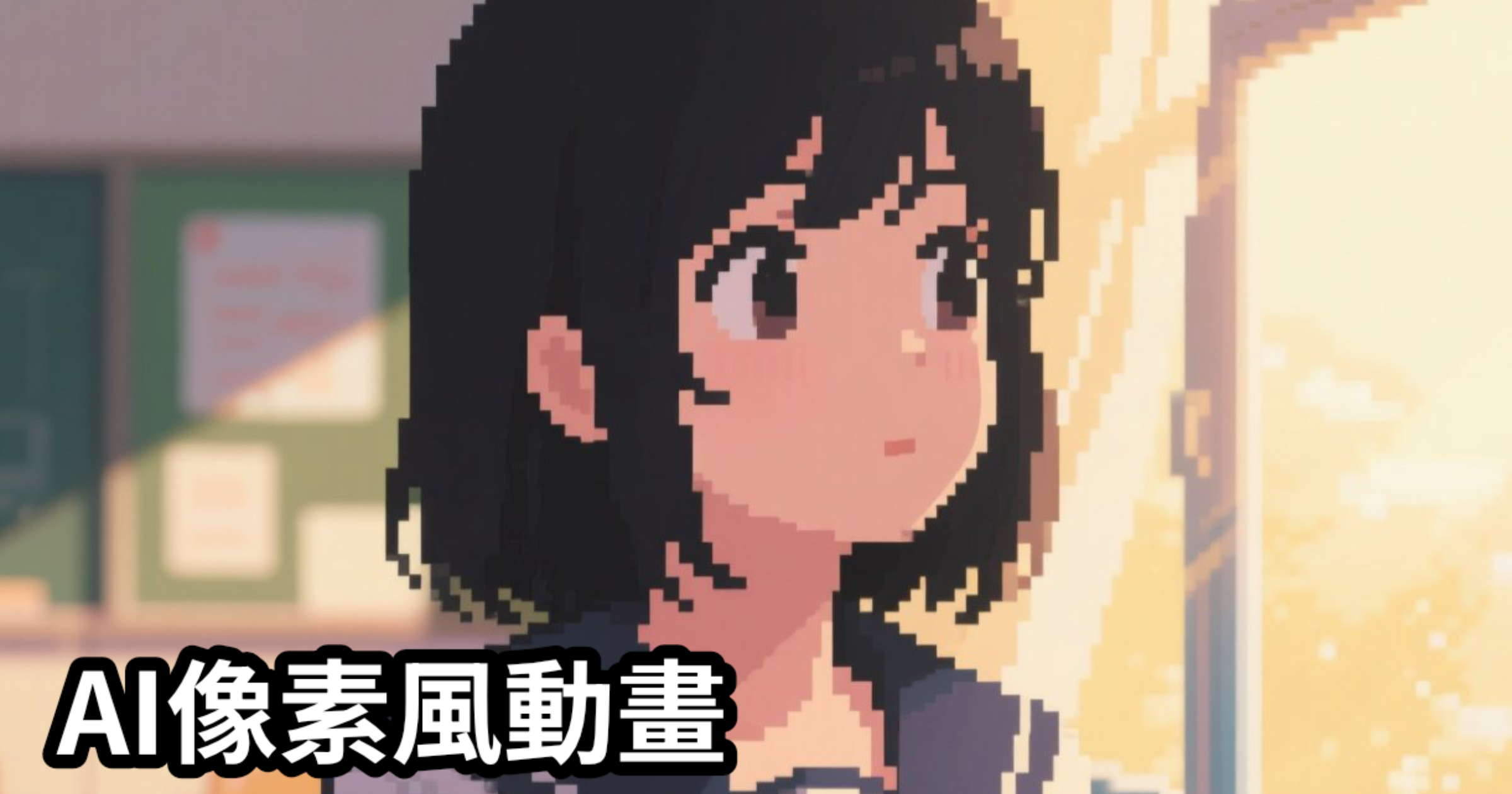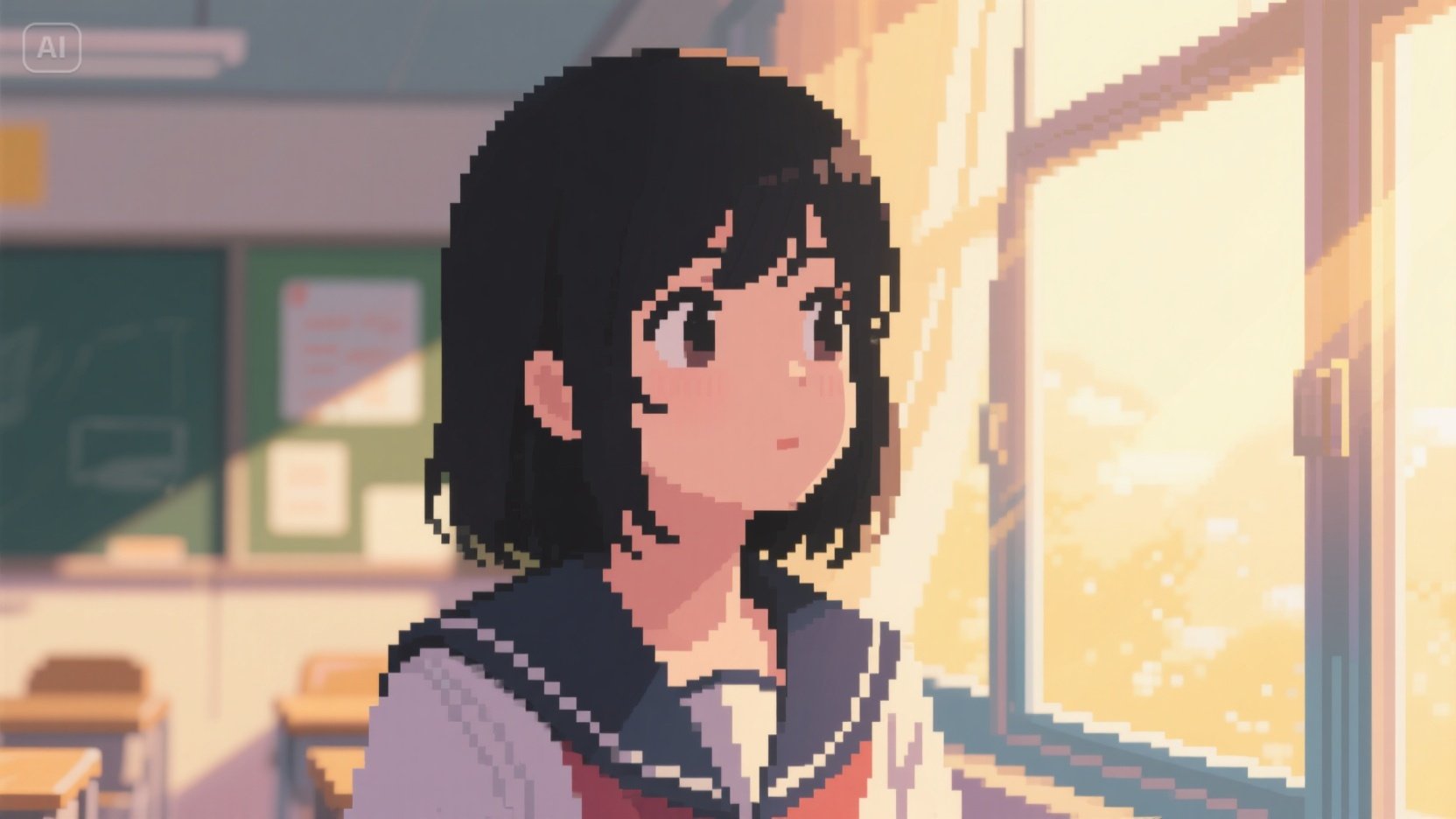 pixel art style, 16-bit, texture, flat 2D perspective, front-facing, close-up. Japanese high school classroom window background, blurred details, golden sunlight shining diagonally across face, black-haired schoolgirl gazing quietly outside, expression calm and thoughtful. pixelated skin and hair texture, soft rim lighting on hair strands, flat color with slight gradient, warm pastel tones, early afternoon setting. pixel grid, sharp edges, nostalgic atmosphere.