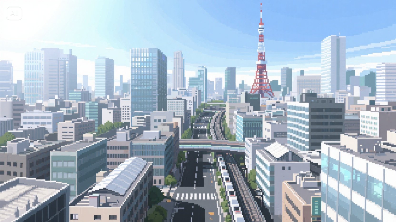 pixel art style, 16-bit, texture, flat 2D perspective, aerial view, wide shot.A densely packed Tokyo city center under bright daylight, layered buildings and main avenues stretch into the distance.High-rise towers, Tokyo Tower silhouette, highways, trains.Pixelated concrete, glass reflections, metal rooftops.Sunlight casting sharp shadows from southeast direction.Midday.No characters, purely urban structure.pixel grid, sharp edges, layered architecture, subtle reflections.Color scheme: grey-white, light blue, metallic silver, asphalt black.Theme: modern, bustling, structured.