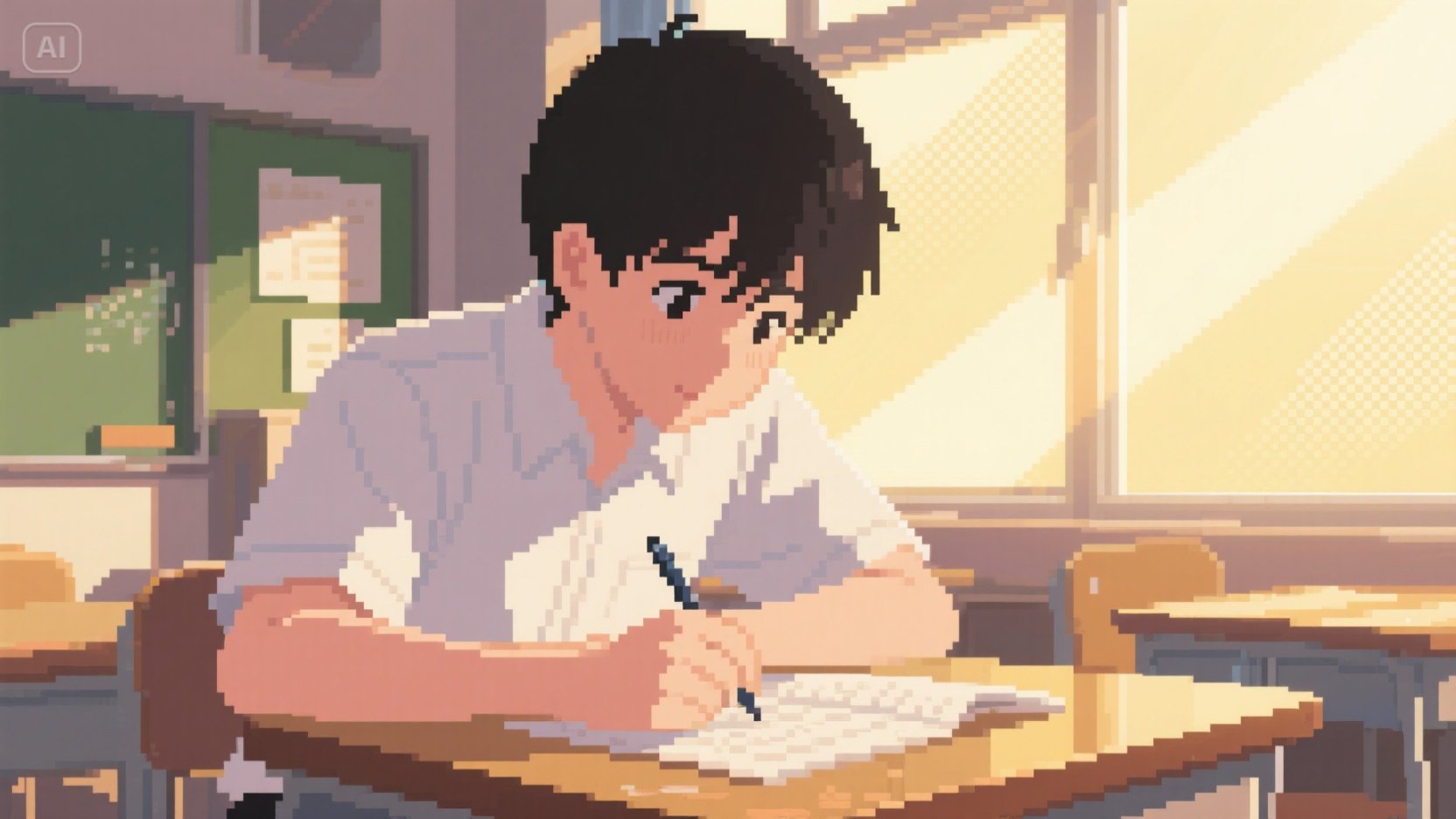 pixel art style, 16-bit, texture, flat 2D perspective, front-facing, close-up. Japanese high school classroom window background, blurred details, golden sunlight shining diagonally across desk and student’s face, black-haired male student leaning slightly forward, focused on writing homework, expression calm and concentrated. pixelated skin and hair texture, soft rim lighting on hair strands and hand, flat color with slight gradient, warm pastel tones, early afternoon setting. pixel grid, sharp edges, nostalgic atmosphere.