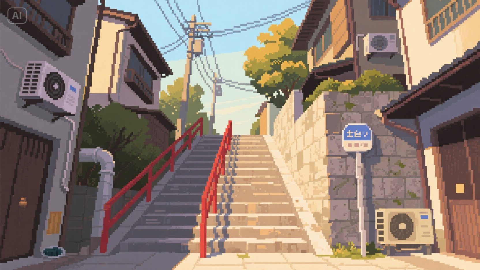 pixel art style, 16-bit, texture, flat 2D perspective, front-facing, wide shot. long urban staircase stretching upward between narrow Japanese houses, red railings, overhead power lines. traditional city alley elements like drainpipes, AC units, and stone signpost. soft afternoon sunlight filtering through trees, casting diagonal shadows on steps and walls. pixel grid, sharp edges, hard outlines, warm color palette, nostalgic and tranquil atmosphere.